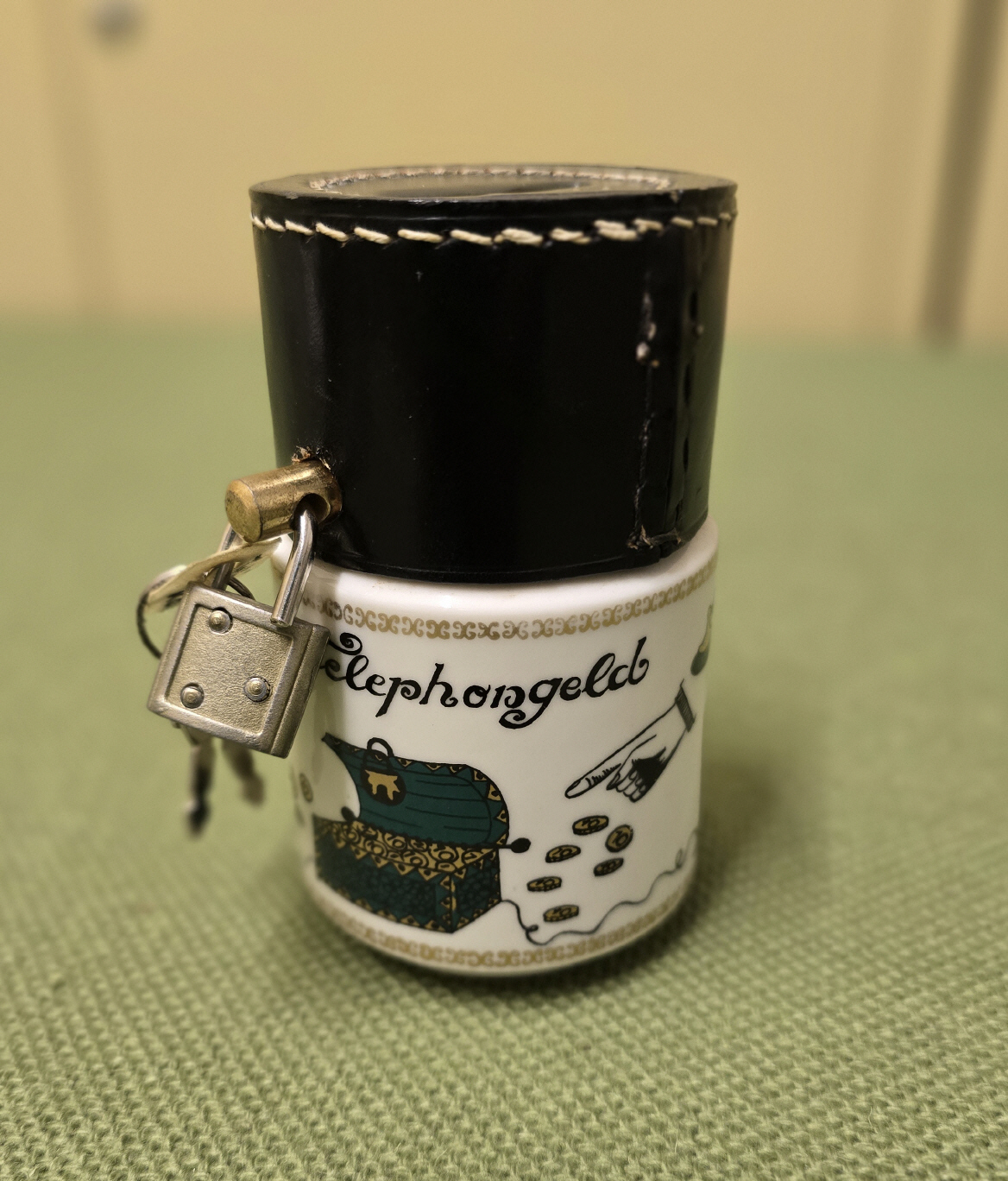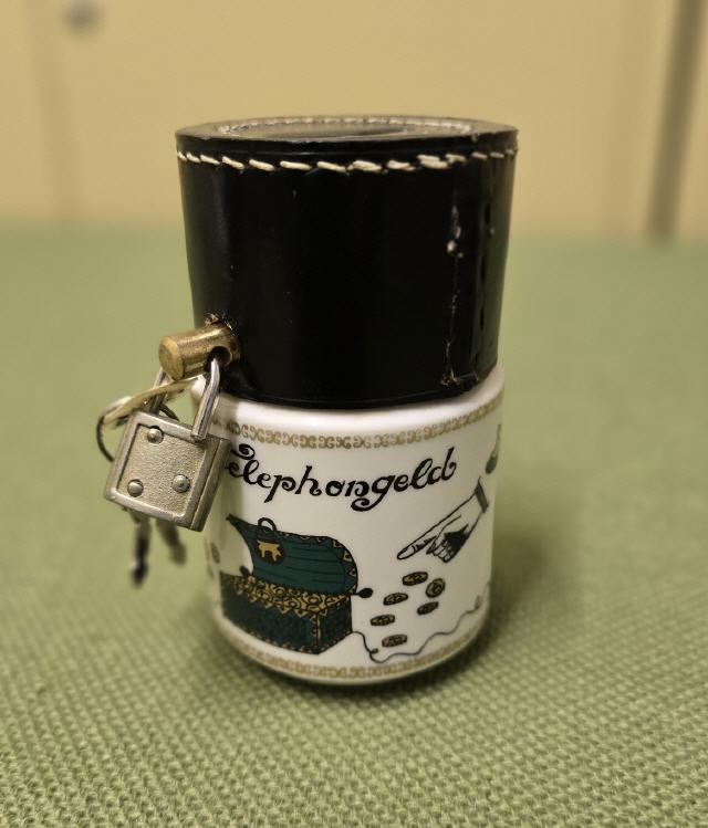 Bei genehmigten Gesprächen musste die Telefongebühr bezahlt werden. Dazu gab es diese kleine Telefongeld Dose mit Vorhängeschloss aus dem Jahre 1968.