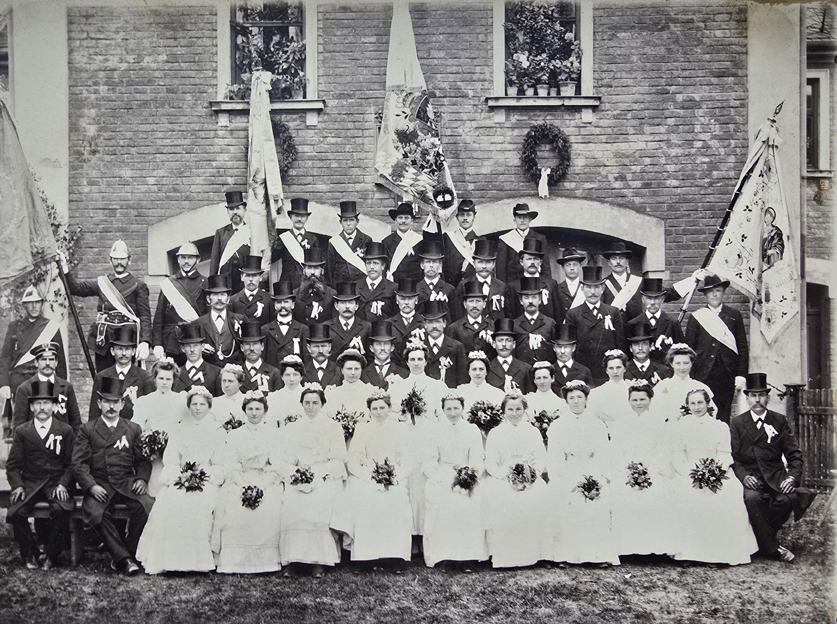 Dieses Foto zeigt Bobinger Festdamen und Festherren vor 120 Jahren.