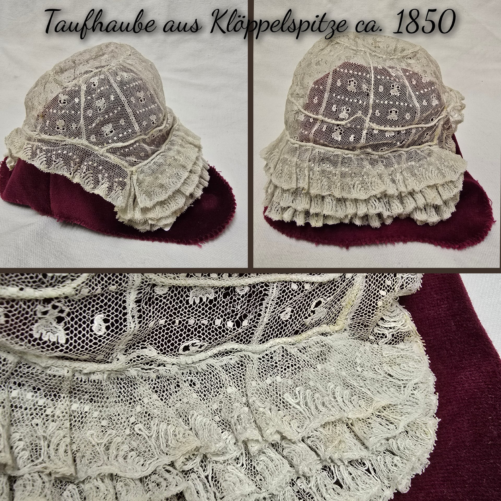 Diese Taufhaube stammt aus der Mitte des 19. Jahrhunderts, also ca. 1850. Dies wurde vom Deutschen Klöppelverband e.V am 5.4.1997 mit einem Echtheitszertifkat bestätigt.