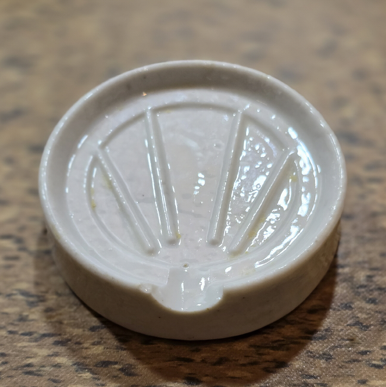 Das Museumsstück ist eine runde, weiße Porzellanscheibe mit dekorativem Muster und beidseitiger Einkerbung am Rand. Sie wird auf den Boden eines Milchtopfes gelegt.