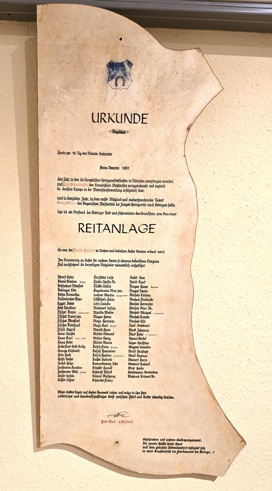 Am 19.9.1981 wurde der Grundstein für die Reitanlage gelegt, die von der Familie Schlecht zu Nutzen und Gedeihen dieses Vereins erbaut wird.