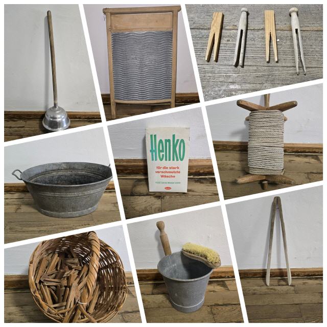 Wasser heiß machen, mit dem Schöpfbehälter heißes Wasser in den Zinkwanne schütten, Wäsche mit der Wäschezange rausnehmen aus dem Wäschekessel, mit der Wurzelbürste Wäsche schrubben auf dem Waschbrett, stampfen mit dem Wäschestampfer, Wäsche aufhängen auf die Wäscheleine mit den Holzklammern.