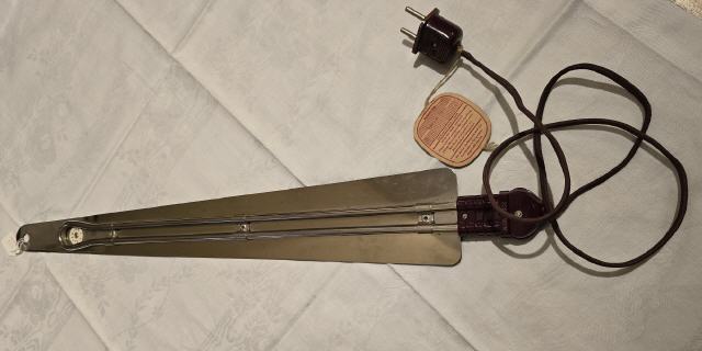 Der elektrische Krawattenbügler Typ Fasson der Firma Elektrolüd E. Schmidt & Co. ist noch mit dem originalen Garantieschild versehen. Er stammt ca. von 1954.