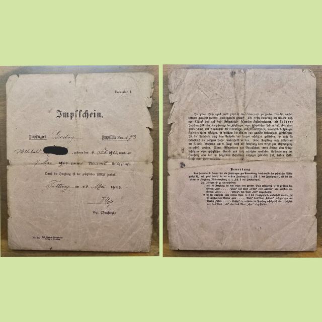 Beim Ordnen der Gebetsbücher fanden wir diesen Impfschein von 1904. Damals war die Pockenimpfung eine Pflichtimpfung.